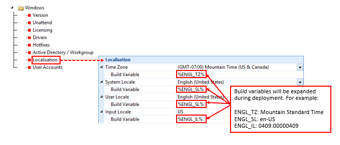 Nearly every setting in a project can be configured to use a variable. In this example the company wishes to control the localisation and registration settings using variables.