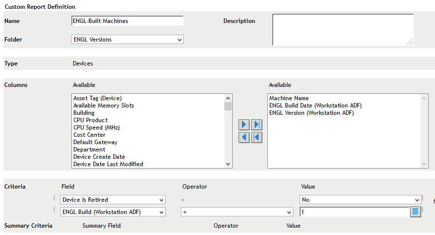 - Create an Inventory Custom report and add ENGL Build = 1 to the criteria, and select the desired fields