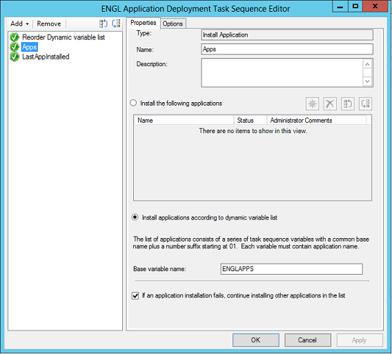 When the Dynamic variable list has a gap in it (ENGLAPPS02, ENGLAPPS03, ENGLAPPS05) then the application installation will halt at the gap. Microsoft are aware of this problem and provide a script which takes the name of the Dynamic Variable List and repairs any gaps in the order. We have amended the script to allow it to log to the ztoolkit.log file.