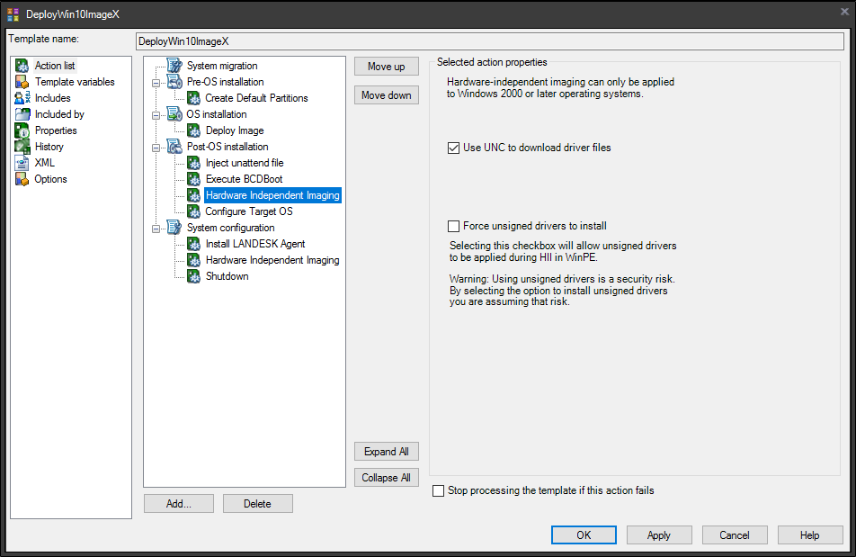 - Select Post-OS installation. Note the position of the Hardware Independent Imaging action then delete the action.