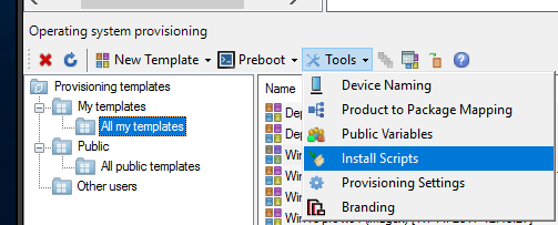 - When the Operating system provisioning dialog opens, select Tools > Install Scripts.