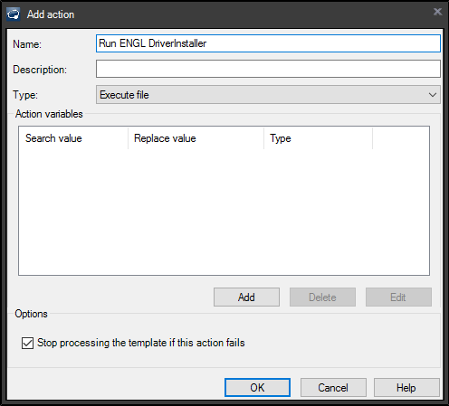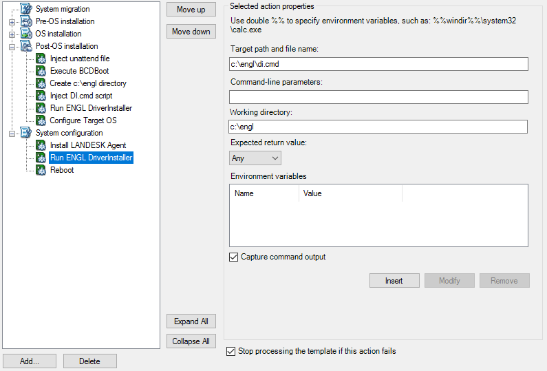 To install these drivers we need to add a “Run ENGL DriverInstaller” action into the System configuration section of the action list. The steps are exactly as before but this needs to happen after the Install LANDESK Agent action.